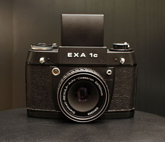 Spiegelreflexkamera für 135er Kleinbildfilm mit Klappenverschluss, Rückkehrspiegel (kein Rückschwingspiegel), Lichtschachtsucher, optional Prismensucher.