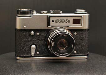 Sowjetische Messsucherkamera für 135er Kleinbildfilm mit Tuchschlitzverschluss und M39 Gewinde für Wechselobjektive.