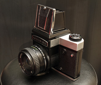 Ukrainische Spiegelreflexkamera für Mittelformat 6x6 mit Pentacon Six Wechselobjektivbajonett.