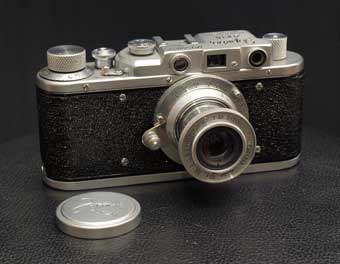 Russische Messsucherkamera für 135er Kleinbildfilm mit Tuchschlitzverschluss und M39 Gewinde für Wechselobjektive.