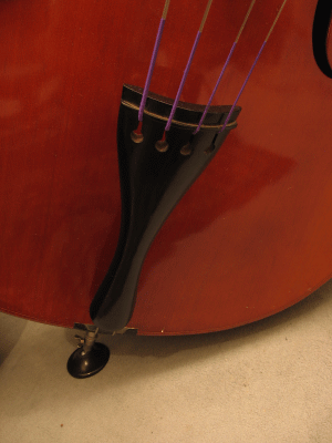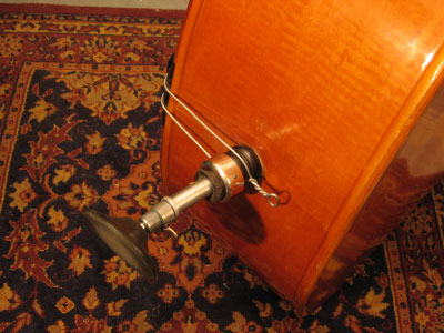Hier ist an den Stachel übrigens ein Gummiteller angeschraubt , damit der Bass auf glattem Boden nicht wegrutscht.