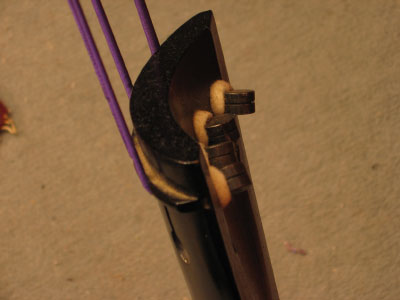 sondern wird nur durch die Spannung der Saiten gehalten. Ohne Saiten fällt er ab. Man kann ein wenig die Dicke der Saiten erahnen. Die dickste ist ca. 3-4 mm dick.