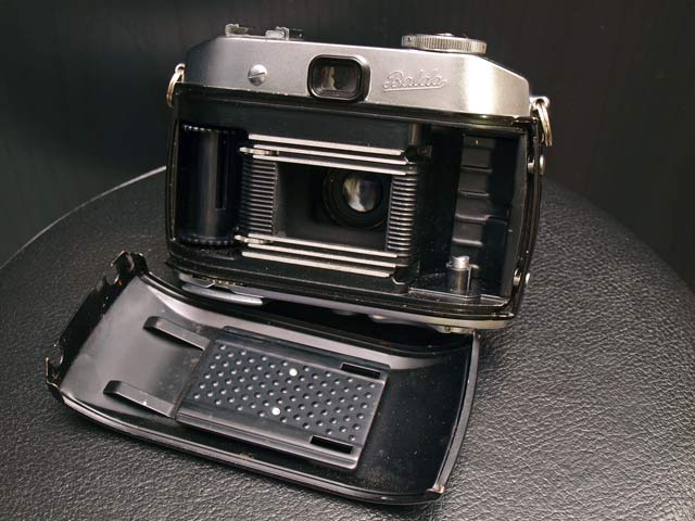 Baldessa 1b von hinten, die Filmpatrone wird rechts eingelegt, genoppte Filmandruckplatte