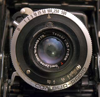 Vorkriegskamera Jubilette, die als günstige Variante der Baldina meist mit einfachen Tripletlinsen ausgestattet war.