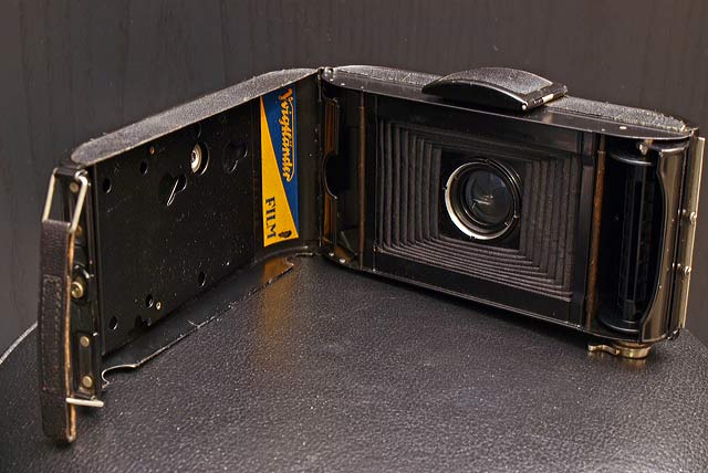 Hinten offene Bessa mit original Aufkleber für Voigtländer Film, Filmeinlegen bei eingefaltetem Balgen